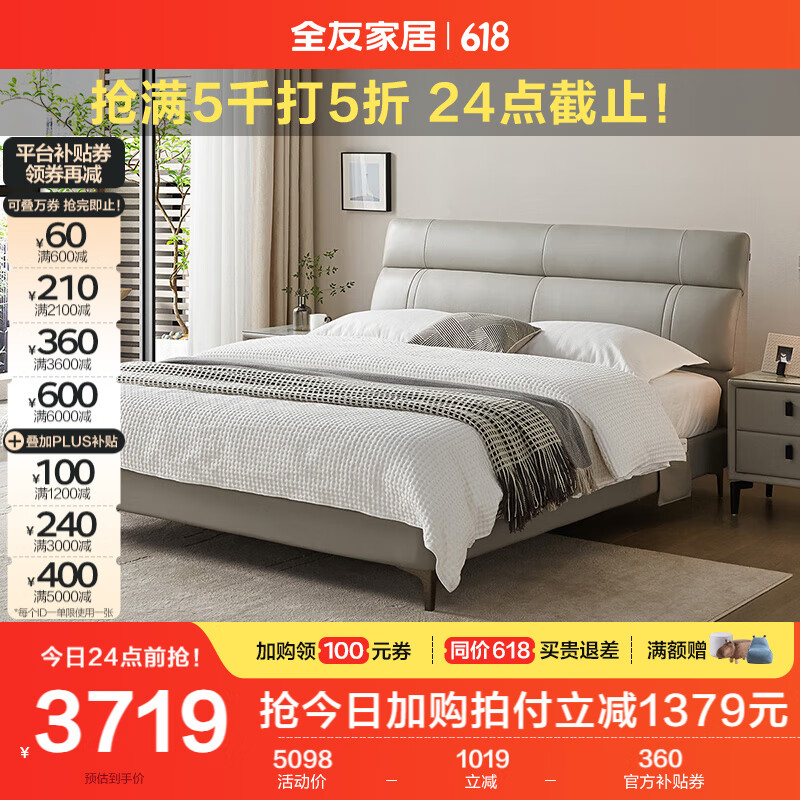 全友家居 真皮床 头层牛皮现代简约主卧室双人皮艺软包大床轻奢105251价格:5098.75元!