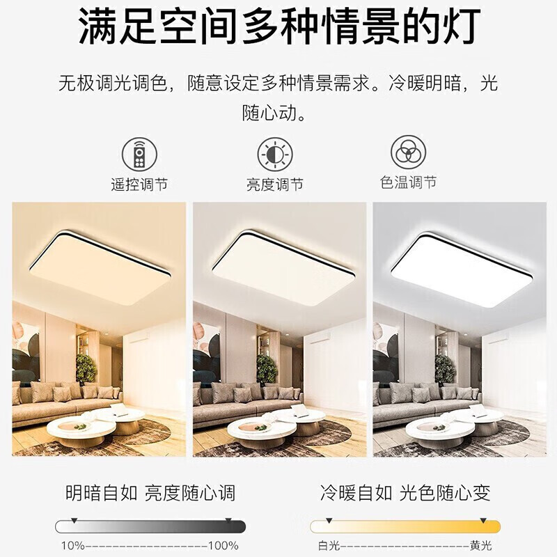 1、外观款式:外观简单干净,属于朴素版的。灯光效果:4色可调。冷光暖光随意切换。120W完全满足需要。操作控制:操作简单易上手。材质工艺:材料很好。轻便易安装。推荐给大家。