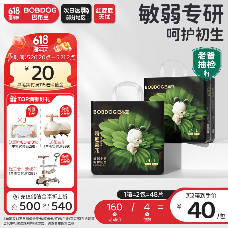 巴布豆(BOBDOG)【老爸】奇迹奢宠婴儿纸尿裤L码48片(9-14kg)凤凰草植萃舒敏价格:158.00元!