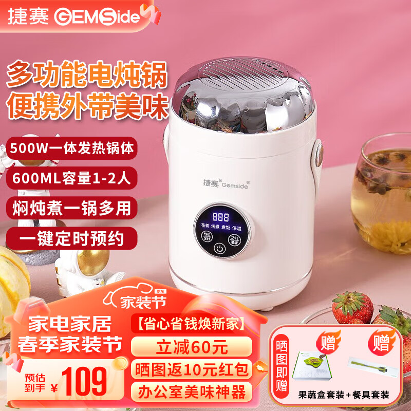 捷赛智能电炖锅 便携式多功能保温锅煮粥煲汤辅食迷你锅 宿舍神器单人电煮锅JS06DG01W价格:109.00元!