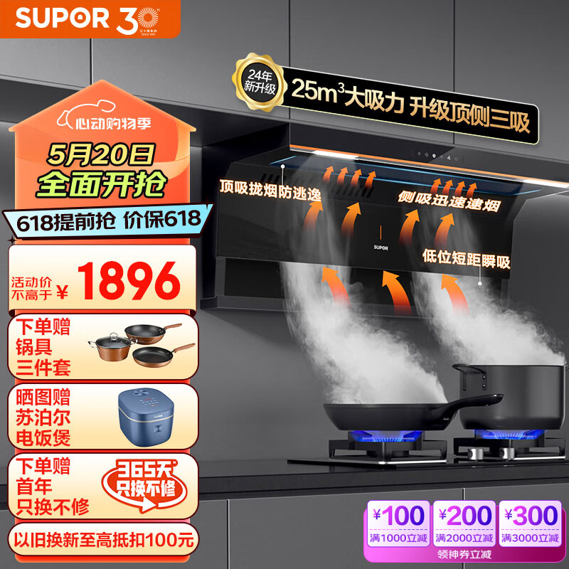 苏泊尔(SUPOR)抽油烟机 双腔拢烟顶侧双吸油烟机 家用抽烟机25立方变频大吸力挥手智控免拆洗吸油烟机DL35价格:1896.00元!