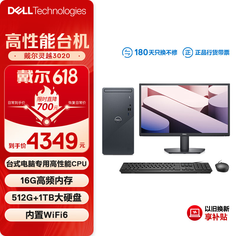 戴尔(DELL)灵越3020 台式电脑主机 (酷睿13代i5-13400 16G 512GB+1TB)21.5英寸显示器 高性能CPU价格:4349.00元!