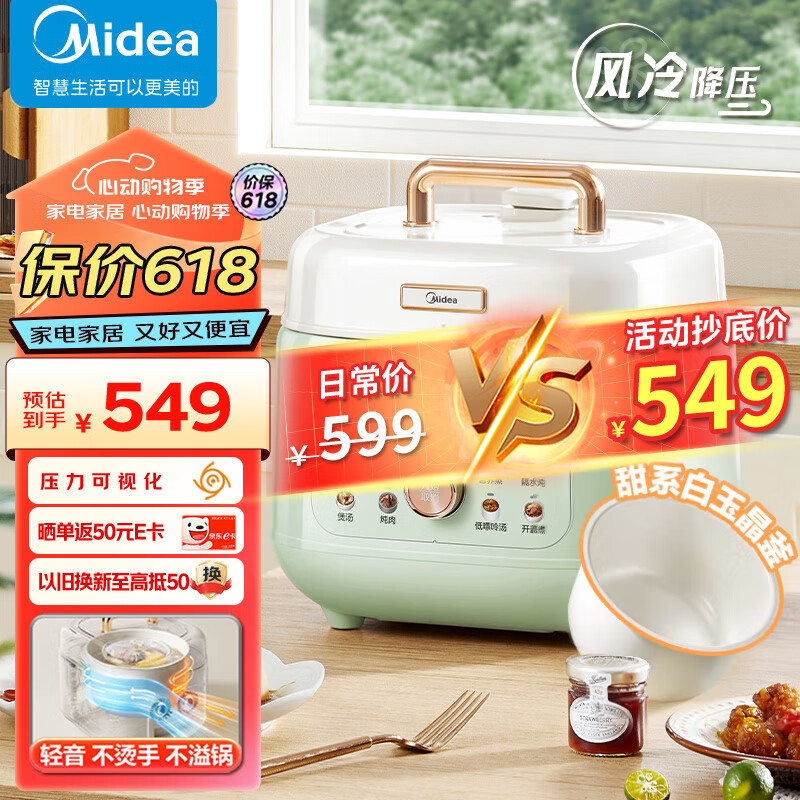 美的(Midea)风冷速香 4L家用智能预约电锅 上蒸下炖 不粘内胆 旋钮操控易清洁高压锅饭煲MY-C4642C(2-8人)价格:549.00元!