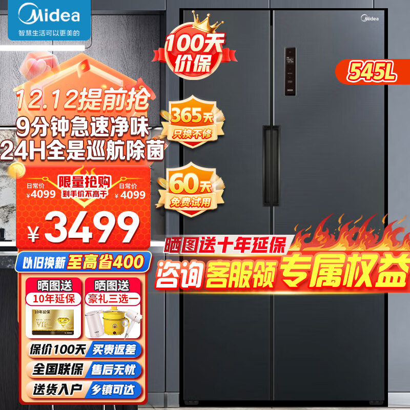 美的(Midea)9分钟急速净味545升对开门冰箱一级双变频风冷无霜智能电冰箱家用除菌超薄大容量BCD-545WKPZM(E)价格:3999.00元!