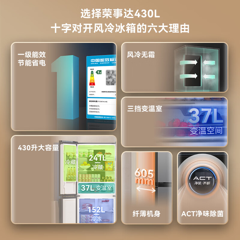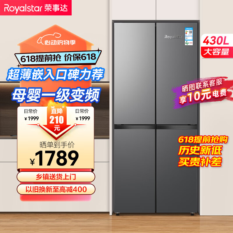 荣事达(Royalstar)430升超薄嵌入十字对开双开四开门家用电冰箱 高湿锁水分储不串味 全景式大冷藏R430FC价格:1899.00元!