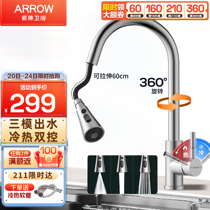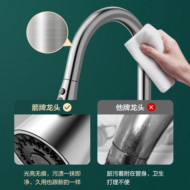 箭牌(ARROW) 厨房抽拉式龙头 水槽冷热水龙头可旋转抽拉龙头 不锈钢 三功能抽拉龙头价格:349.00元!