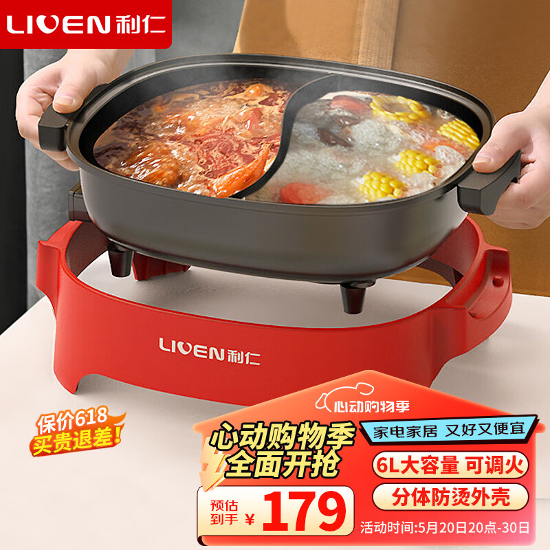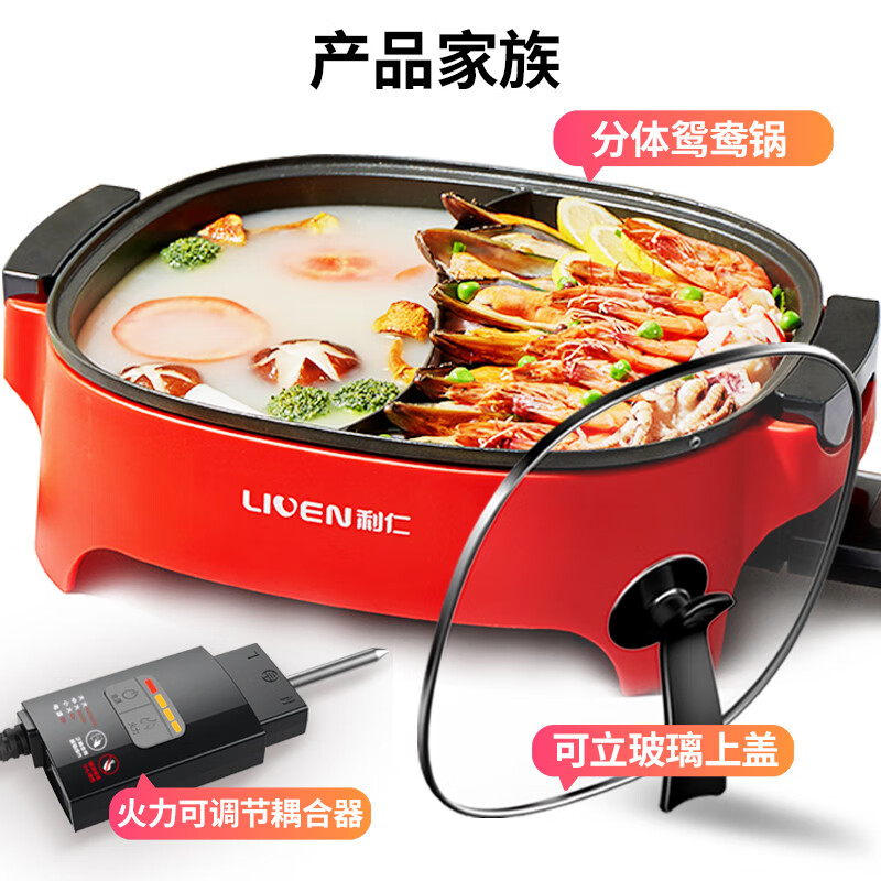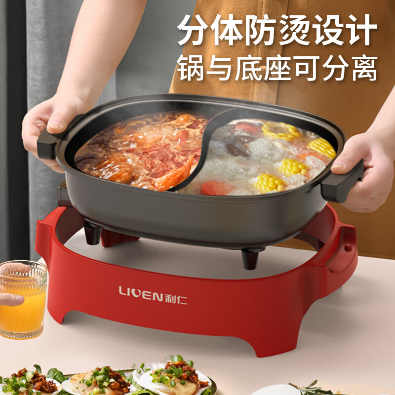 利仁(Liven)鸳鸯锅电煮锅电火锅专用锅分体式家用多功能电热锅宿舍泡面锅多用途锅料理涮烤肉锅6升 DHG-600BY价格:179.00元!