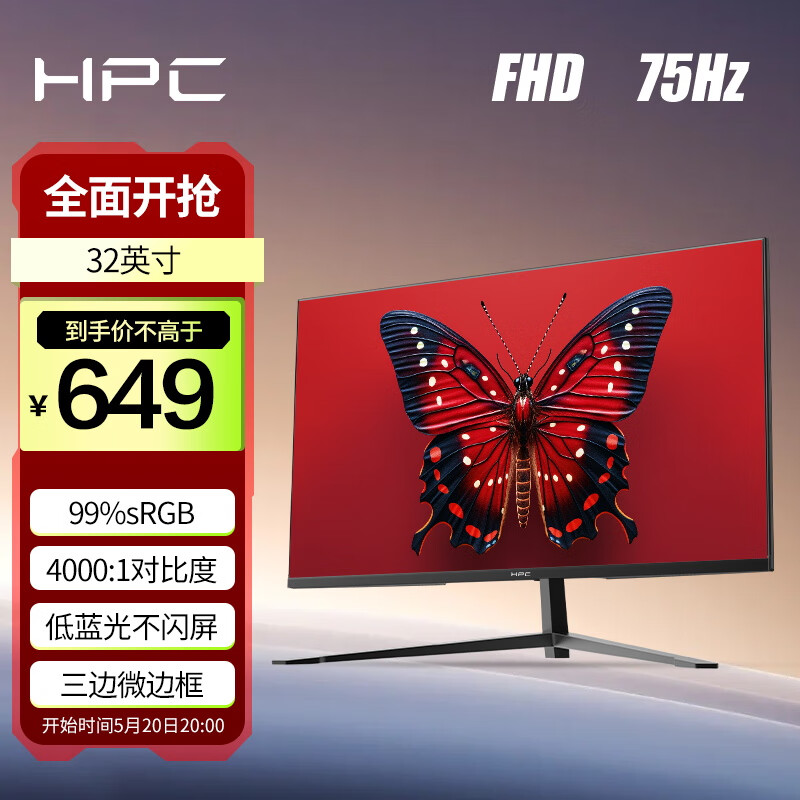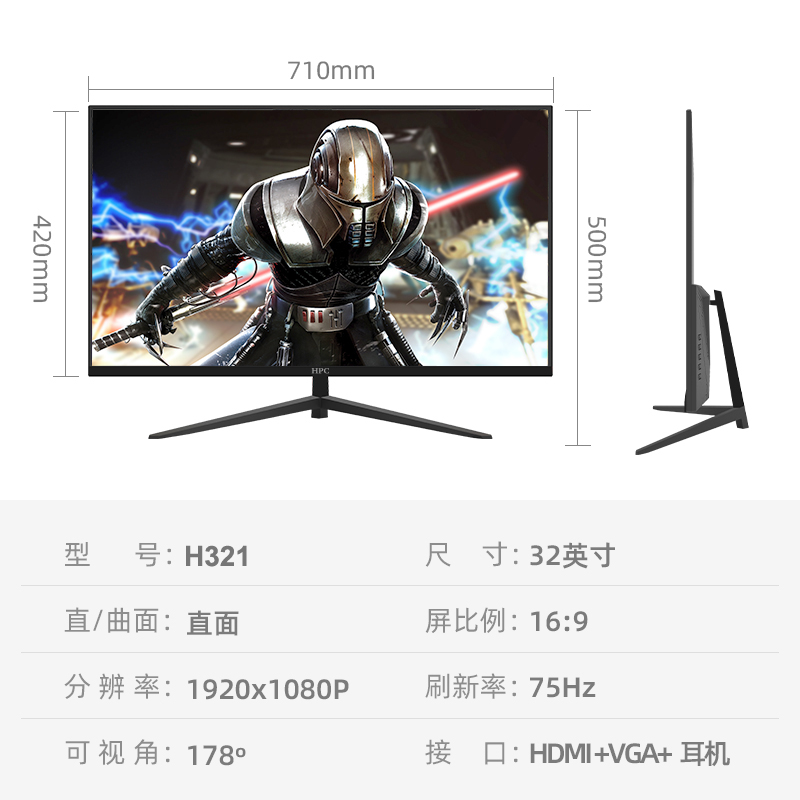 HPC 31.5英寸 精选华星面板 75Hz 99%sRGB广色域 HDMI接口 游戏电竞显示器H321价格:749.00元!