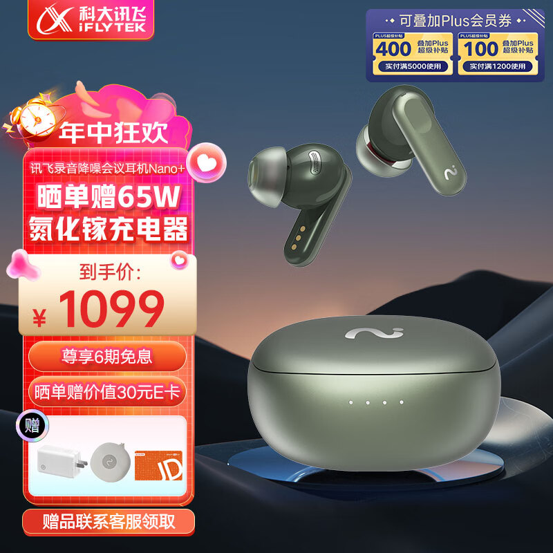 科大讯飞(iFLYTEK)录音降噪会议耳机Nano+ 沁光绿 无线蓝牙耳机 主动降噪 入耳式 同传听译 录音转文字 苹果华为通用价格:1299.00元!