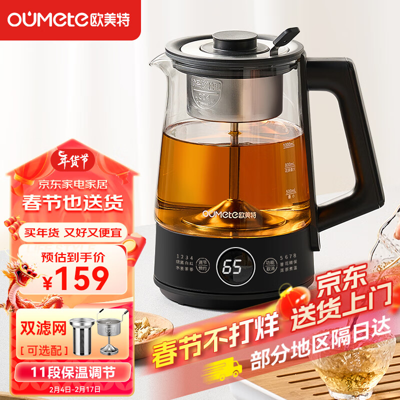 欧美特(OUMETE)恒温煮茶壶 煮茶器 喷淋式蒸汽茶壶 养生壶 玻璃保温煮茶烧水壶OMT-PC1051双网配置价格:159.00元!