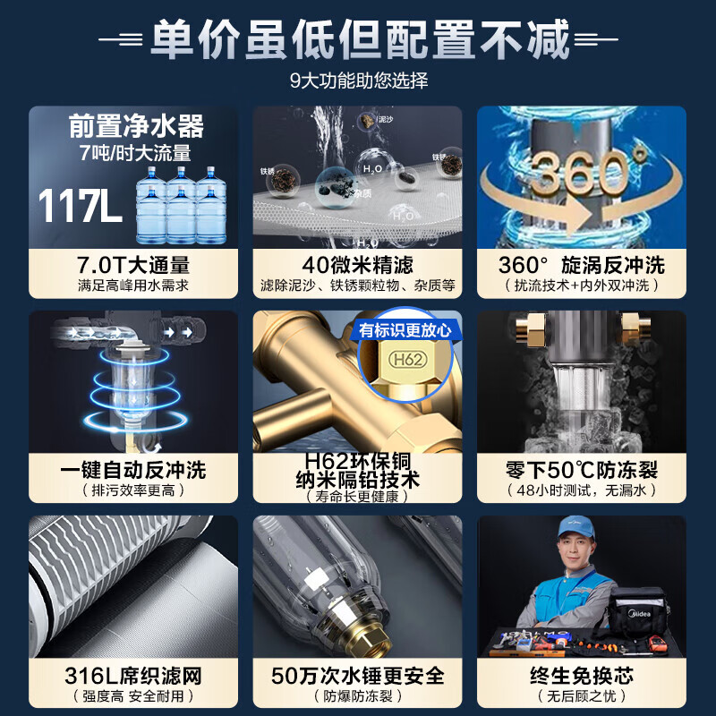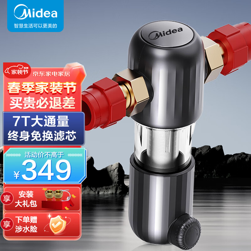 美的(Midea)前置过滤器家用全屋自来水过滤器净水器自动正反冲洗中央净水机7T大通量 终身免换滤芯价格:349.00元!