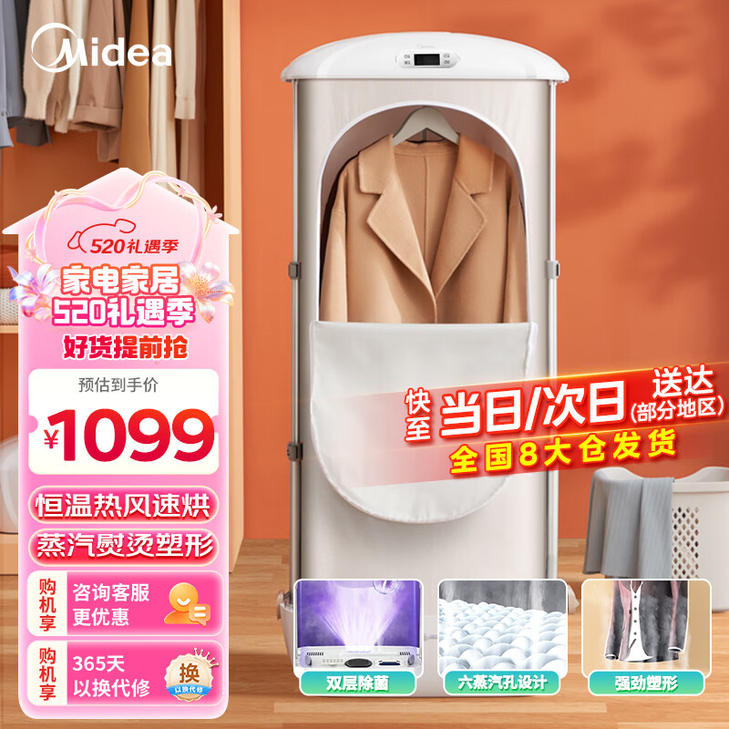 美的(Midea)衣物护理机 烘干机家用婴儿 全自动挂烫机 蒸汽熨烫除皱 高温杀菌香薰祛味 干衣机 MHJ90-01QUW价格:1099.00元!