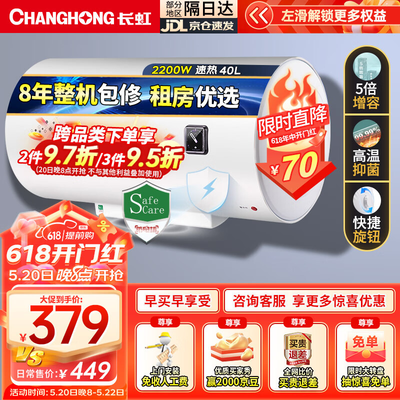 长虹(CHANGHONG)储水式家用电热水器40升2200W速热五倍增容节能下沉加热抗腐耐用双重防漏电Y40J01价格:378.00元!