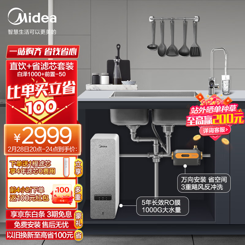美的(Midea)省芯直饮净水器套装【白泽1000G+前置过滤器-50】厨下式智能水龙头 RO反渗透家用一体净饮机价格:2999.00元!
