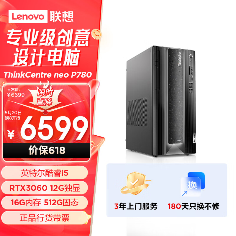 联想ThinkCentre neo P780 设计师游戏商用台式电脑主机(酷睿12代i5-12400F 16G 512G RTX3060 12G)价格:6599.00元!
