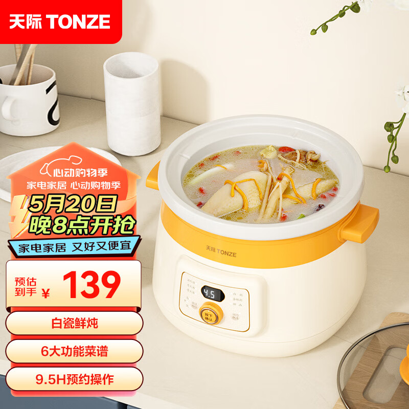 天际(TONZE)电炖锅 炖汤锅 家用陶瓷全自动电炖盅煮粥神器养生多功能炖锅 黄色3升电炖锅DGDD23A30AMBW价格:139.00元!