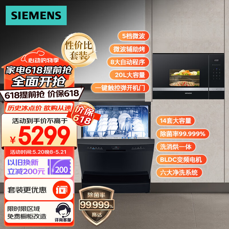 西门子洗嵌套装 14套大容量家用洗碗机+嵌入式微波炉组合套装 SJ23HB66KC+BE525LMS0W价格:5299.00元!