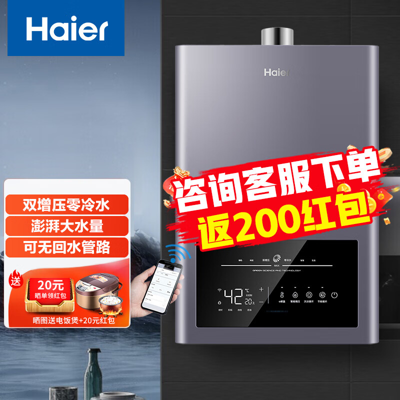 海尔(Haier)零冷水燃气热水器18升双增压家用大水量水气双调恒温净水洗自检天然气WiFi智控MAX价格:2399.00元!