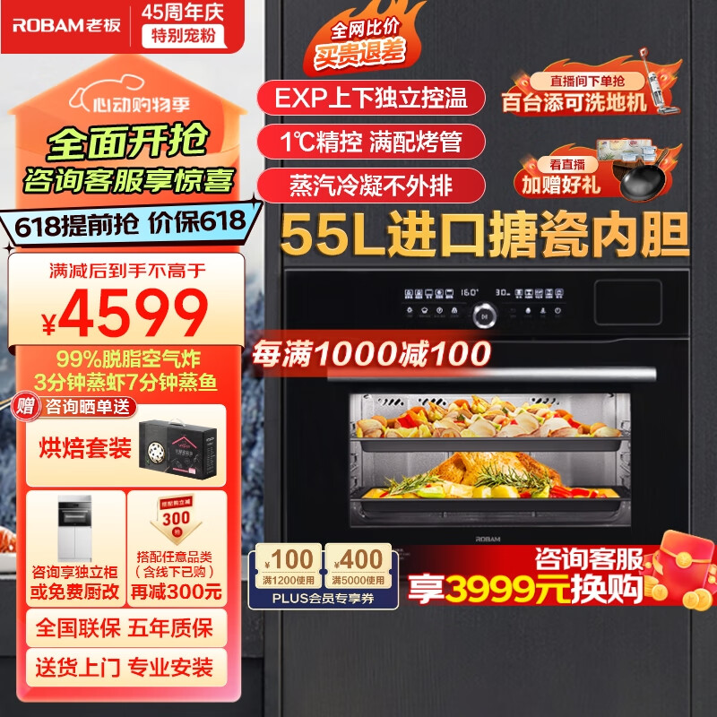 老板(Robam)CQ9062D小食光脱脂蒸烤箱一体机嵌入式EXP专业控温蒸烤炸炖家用55L搪瓷蒸箱烤箱自清洁保温箱价格:5298.00元!