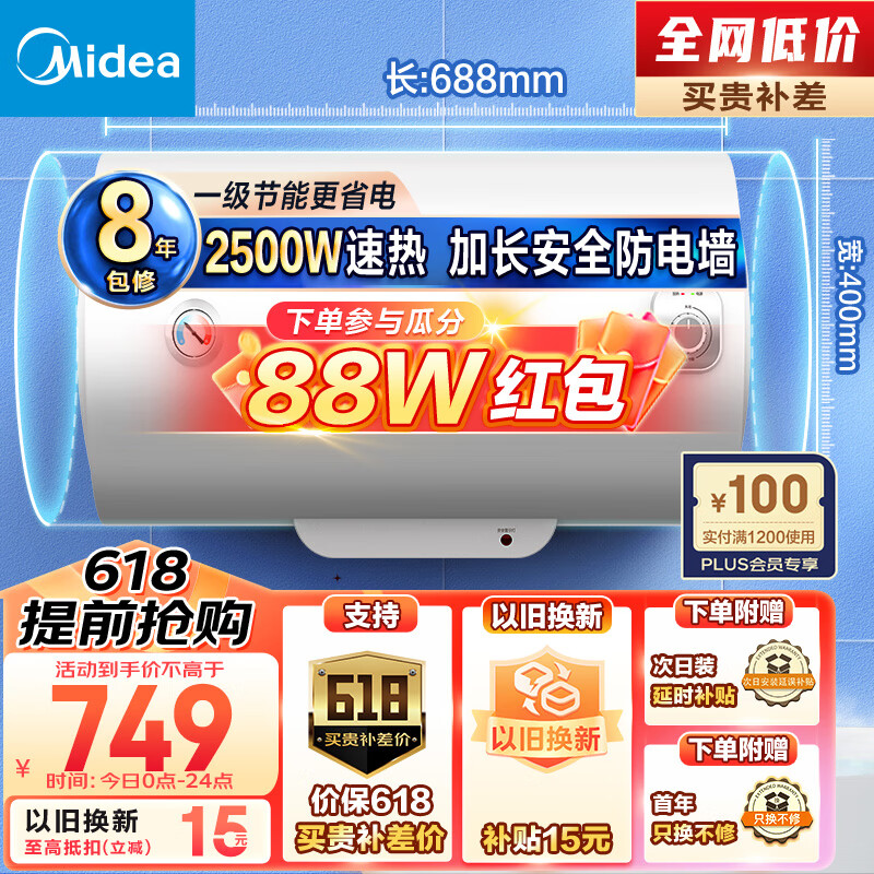 美的(Midea)电热水器2500W速热家用一级能效50升节能省电加长防电墙漏电提醒小型储水式洗澡F5025-A5(HE)价格:749.00元!