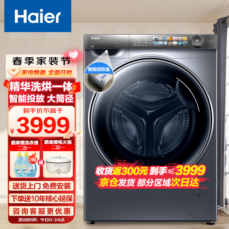 海尔(Haier)10KG精华洗滚筒洗衣机全自动家用变频大容量一级能效525mm大筒径+洗烘一体G10028HBD14LS[家电]价格:4299.00元!