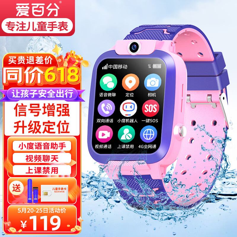 爱百分 儿童智能电话手表移动联通电信版手机学生男孩女孩精准定位拍照触屏视频通话儿童节礼物 粉色升级版(长续航+定位升级+视频+微聊+禁用)价格:139.00元!