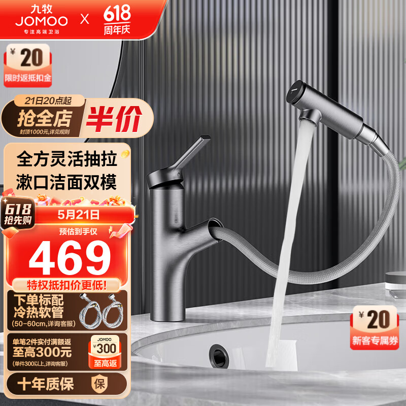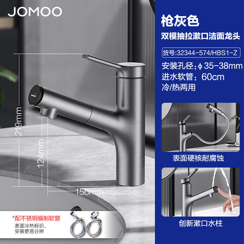 九牧(JOMOO)卫生间位漱口洁面抽拉式台盆面盆水龙头枪灰32344-574/HBS1-Z价格:489.00元!