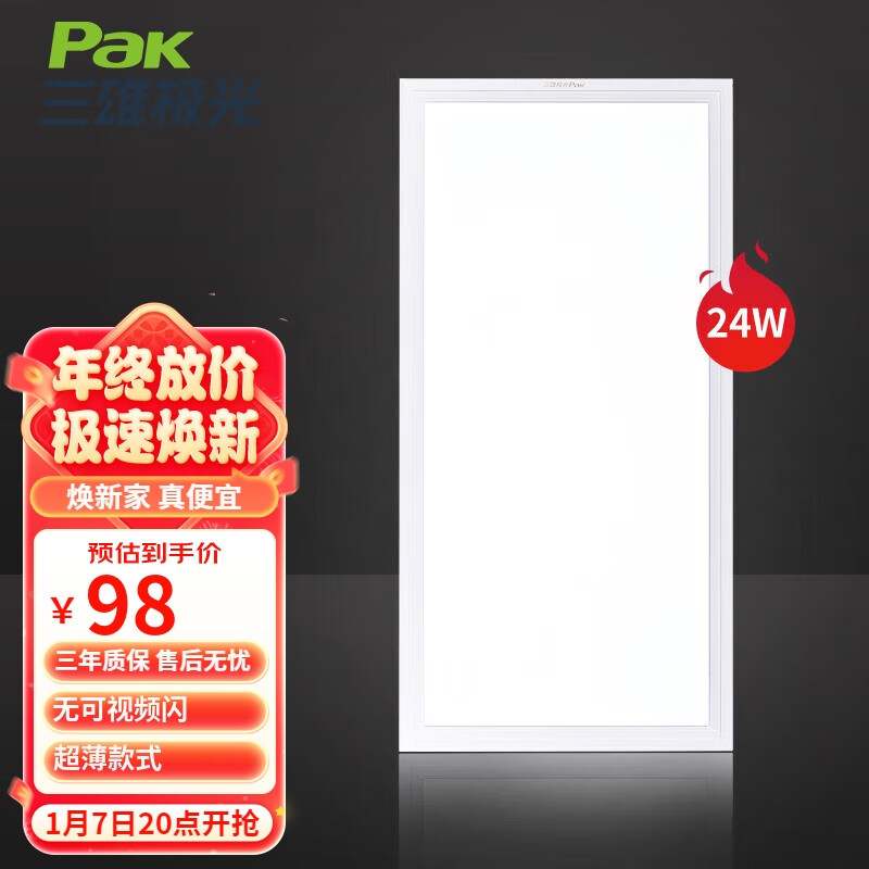 三雄极光 led集成吊顶灯 面板灯平板灯铝扣板厨房灯厨卫灯 24W白光6500K价格:98.00元!