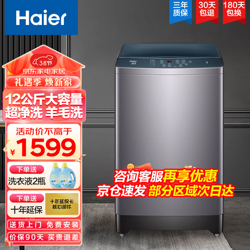 海尔(Haier)12公斤全自动波轮洗衣机家用大容量节能洗脱一体智能预约自编程漂甩合一羊毛洗XQB120-Z5088[家电]价格:1689.00元!