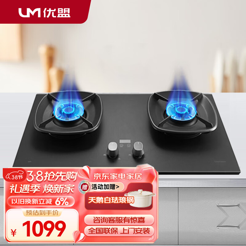 优盟(UM)燃气灶天然气 煤气灶双灶 家用大火力钢化玻璃嵌入式燃气灶定时灶 一级能效5.2kW猛火 UZ277价格:1099.00元!