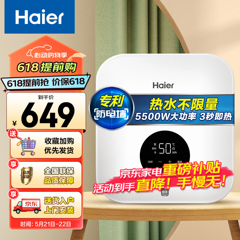 海尔(Haier)即热式小厨宝电热水器电即热 5500W双驱变频即开即热 小尺寸热水无限供应 DSC-55B1价格:649.00元!