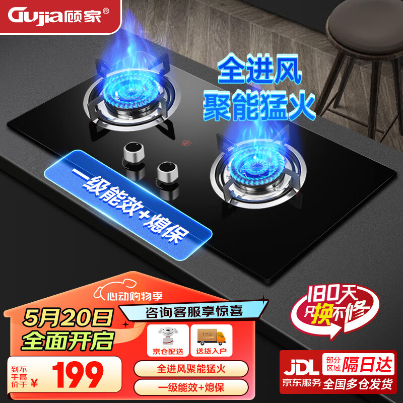 顾家燃气灶煤气灶双灶具嵌入式全进风聚能猛火节能天然气灶液化炉灶台式套装 高性价比丨聚能双旋火丨天然气价格:198.00元!