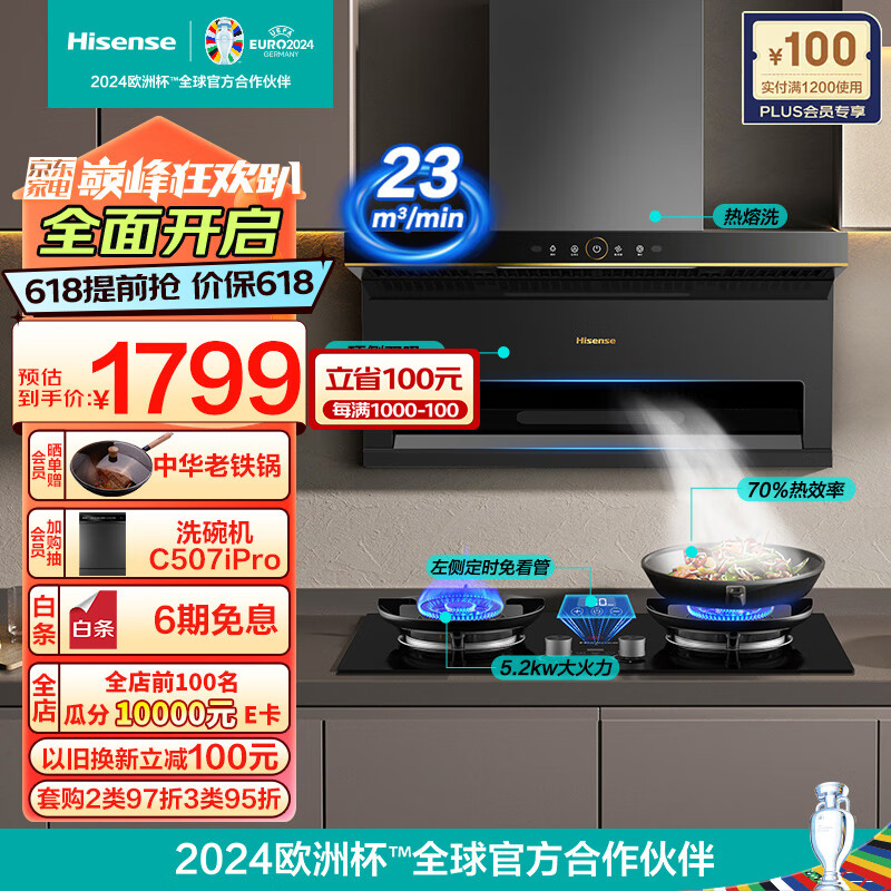 海信(Hisense)油烟机灶具套装 顶侧双吸天然气燃气灶套装 23立方挥手排油烟机5.2kW定时燃气灶DS11+DB33以旧换新价格:1899.00元!