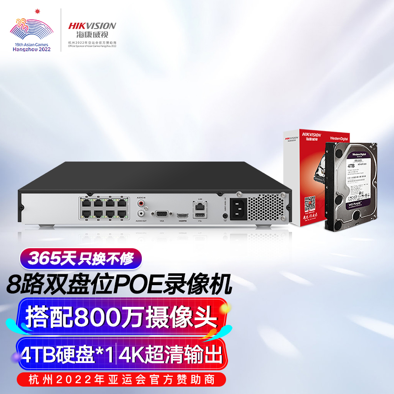 海康威视网络硬盘录像机监控8路POE网线供电NVR满配8个摄像头带4T硬盘DS-7808N-R2/8P价格:2014.00元!