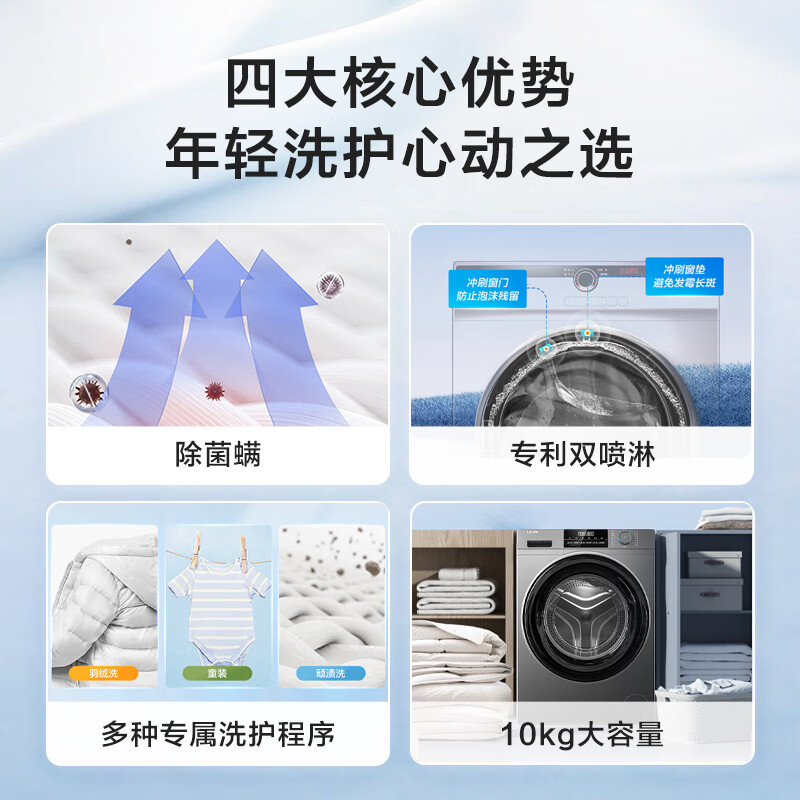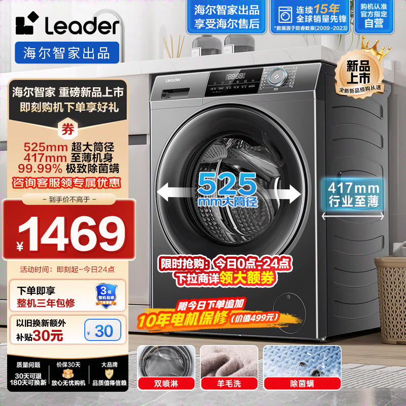 Leader海尔智家出品 滚筒洗衣机全自动 顽渍净洗 超薄家用8公斤 智能内衣裤除菌螨变频 @G80B22SGTD价格:1469.00元!