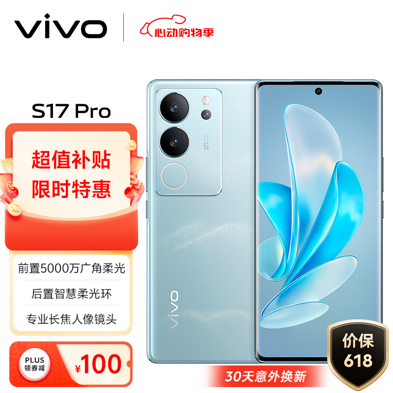 vivo S17 Pro 12GB+512GB 山海青 前置5000万广角柔光 专业长焦人像镜头 天玑8200芯片 快充 拍照手机价格:2399.00元!