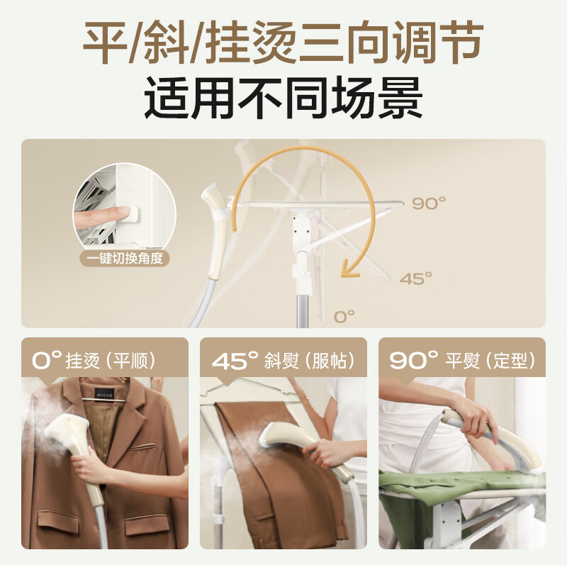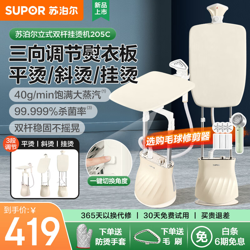 苏泊尔(SUPOR)【一键调节三向】挂烫机家用双杆大功率手持蒸汽熨衣机高效杀菌可分离水箱服装店熨烫机205C价格:419.00元!