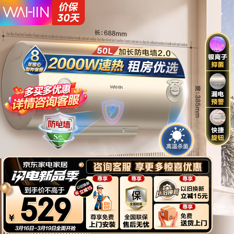 美的(Midea)出品储水式电热水器50升出租屋大功率家电速热节能卫生间洗澡加长防电墙华 凌F5020-KY1(H)价格:529.00元!