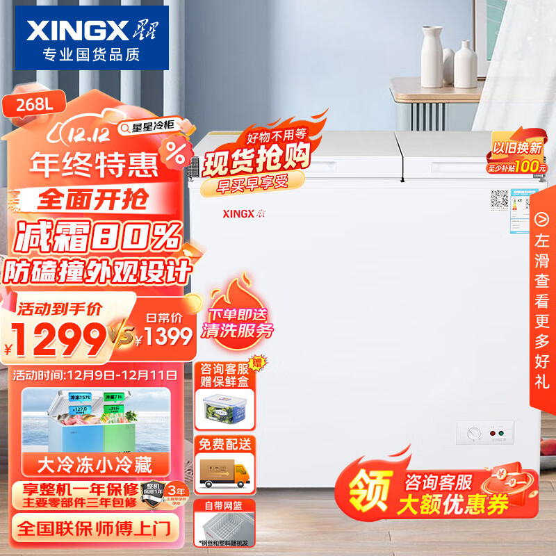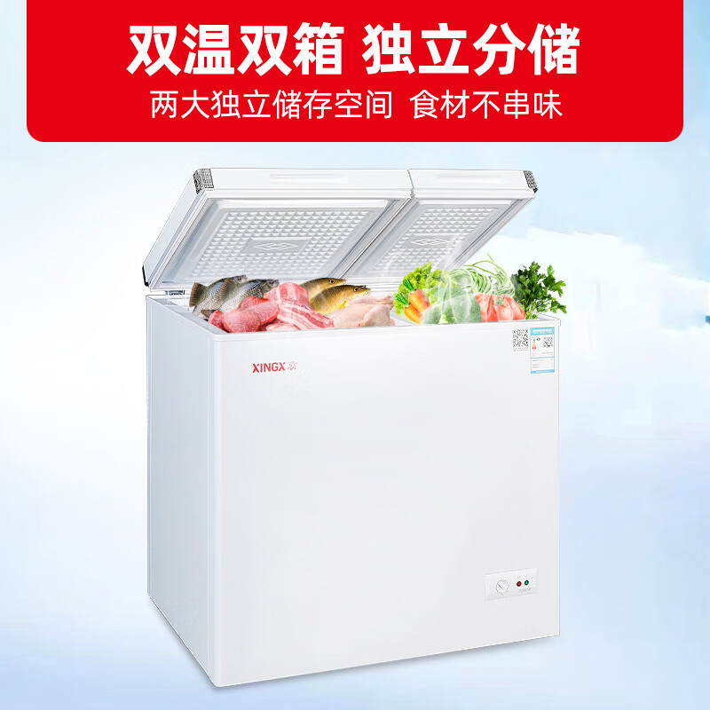 星星(XINGX) 268升小型冰柜双温家用双箱冷柜 左冷冻右冷藏 商用卧式减霜顶开门冰箱 BCD-268GE价格:1349.00元!