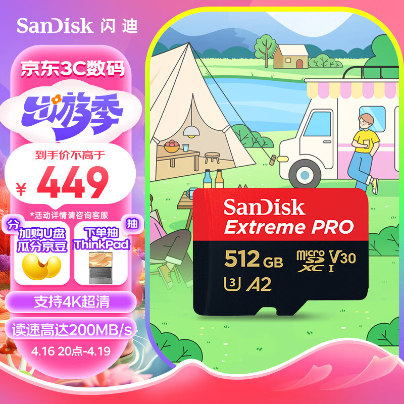 闪迪(SanDisk)A2 512GB TF(MicroSD)存储卡 V30 U3 4K超极速移动版内存卡 读速200MB/s 写速140MB/s价格:449.00元!