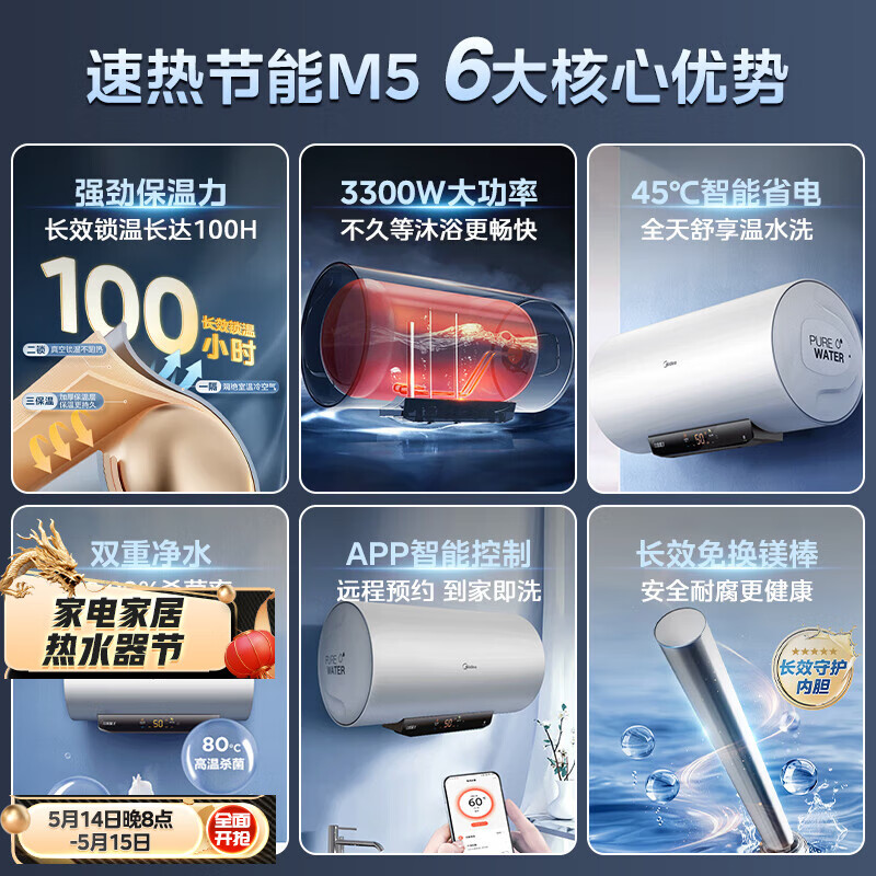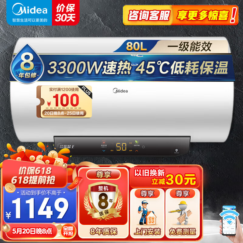 美的(Midea)80升储水式家用电热水器 升级3300W速热 一级节能省电健康防漏电 F8022-M5(HE)价格:1149.00元!