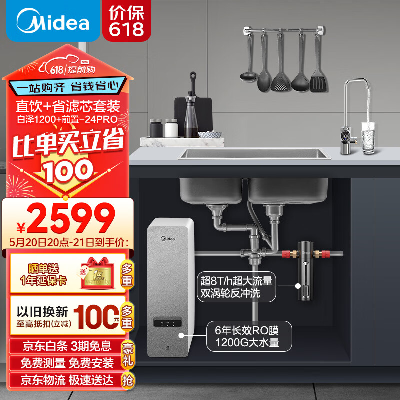 美的(Midea)省芯直饮净水器套装【白泽1200G+前置过滤器-24pro】厨下式智能水龙头 RO反渗透家用一体净饮机价格:2599.00元!