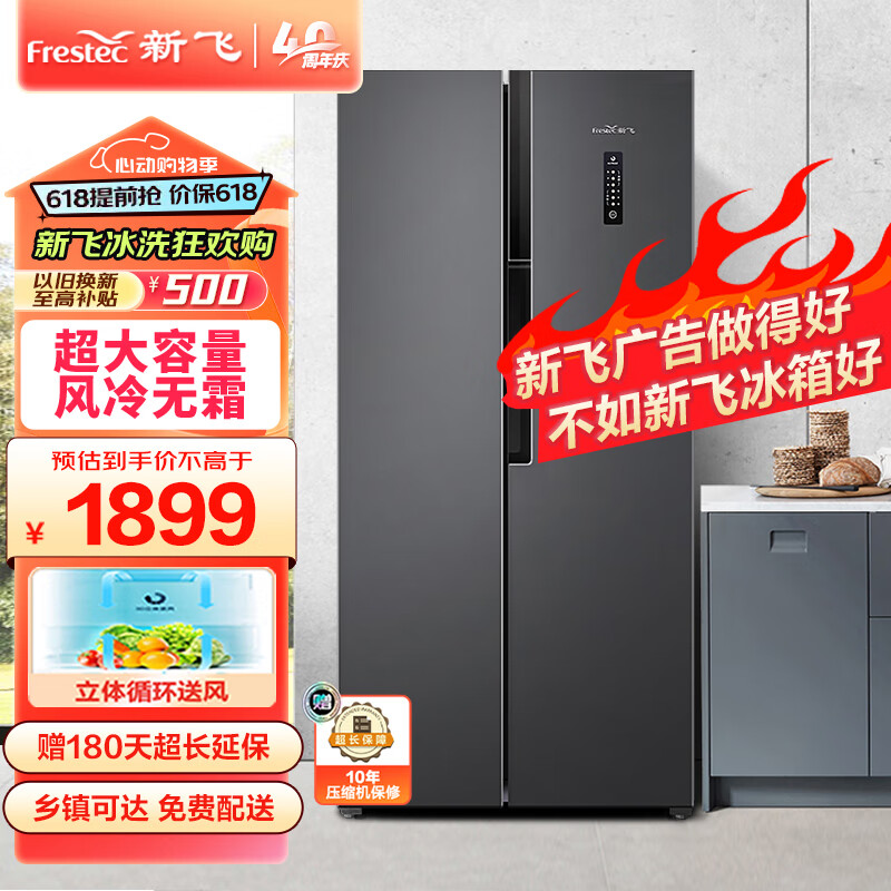 新飞(Frestec)525升风冷无霜对开门家用超薄冰箱超大容量双开门变频多路送风 90°悬停门BCD-525WK9HT价格:1999.00元!