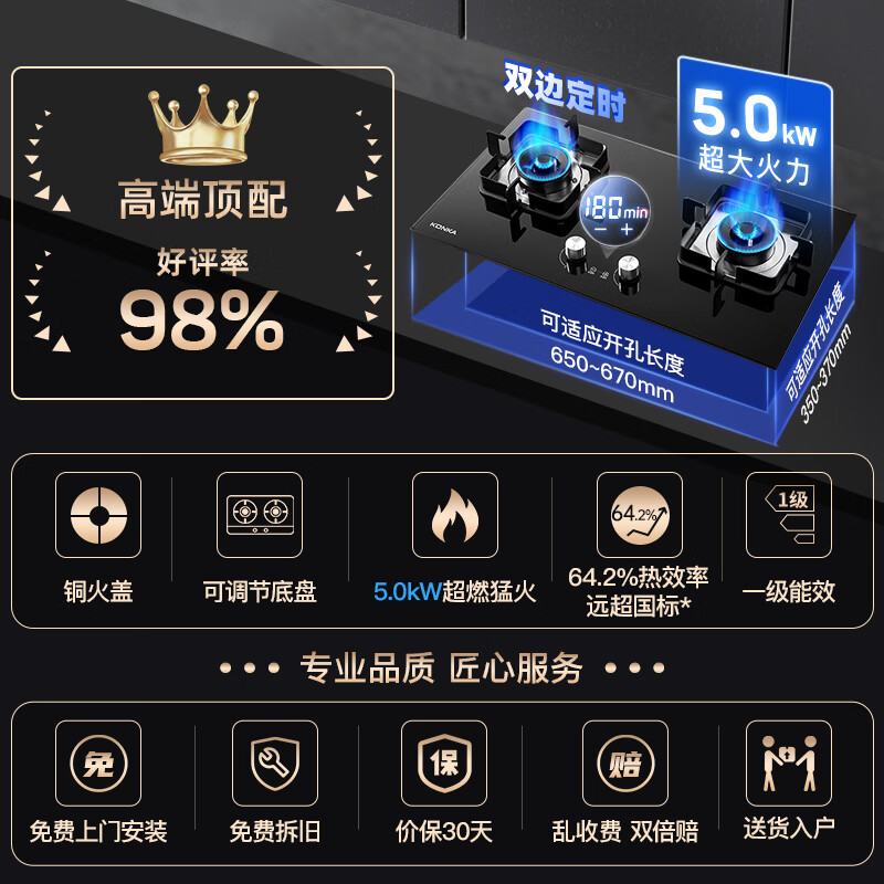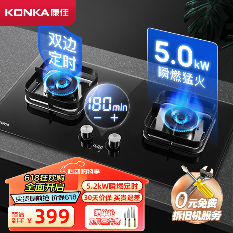 康佳(KONKA)灶具 燃气灶双灶 家用5.0kW秒速点火智能定时猛火灶 台式嵌入式防烫提醒JZY-B520SD(液化气)价格:399.00元!