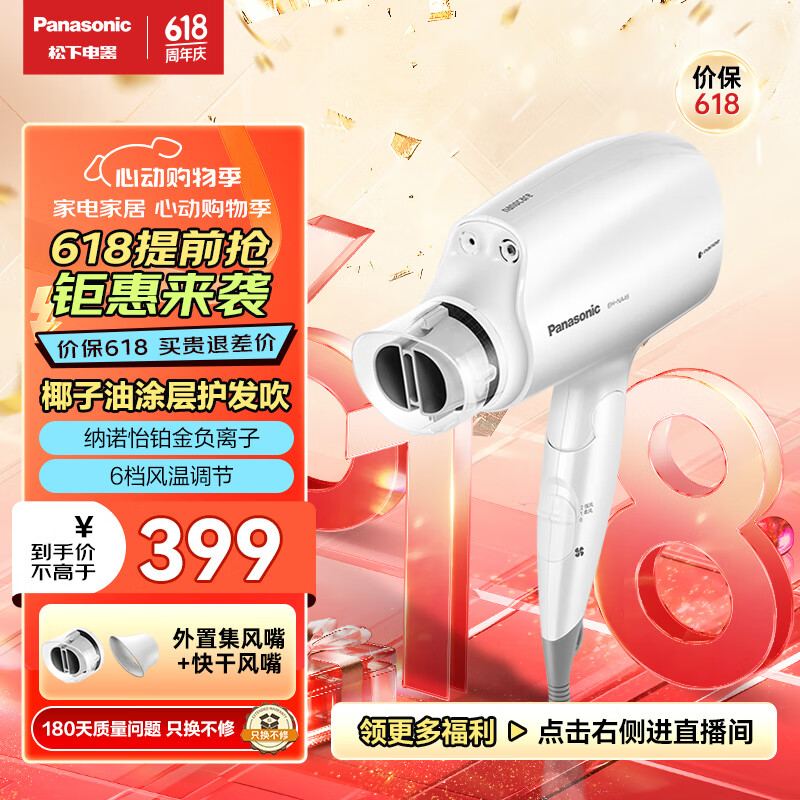 松下(Panasonic)电吹风机大功率高速大风力速干折叠便携送学生宿舍纳诺怡负离子电吹风筒EH-NA46白价格:449.00元!