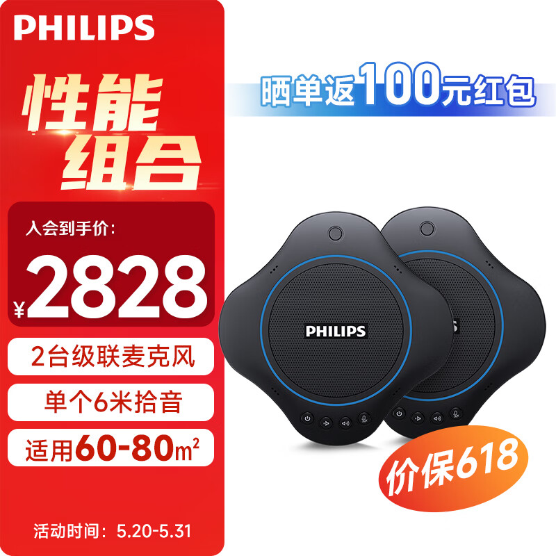 飞利浦视频会议麦克风套装 无线音箱桌面扬声器 60㎡解决方案 全向麦克风带电池级联款500plus*2价格:2828.00元!