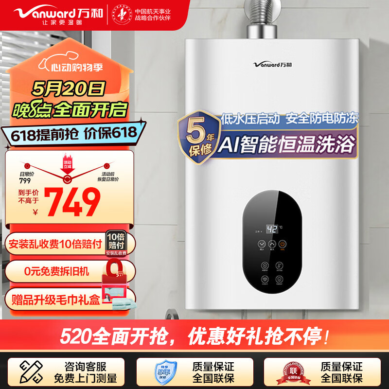 万和(Vanward)13升燃气热水器天然气家用热水器66重防护AI智能体感恒温防电防冻JSQ25-370J13价格:749.00元!