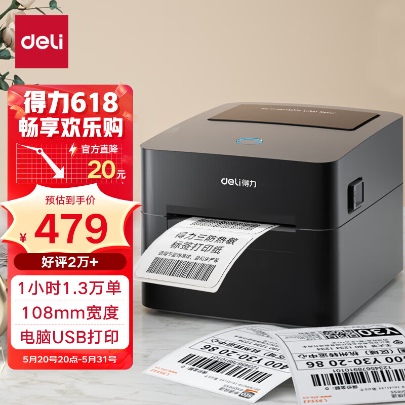 得力(deli)DL-888F热敏标签打印机 快递仓储物流面单固定资产 108mm商用办公打单不干胶条码打印机 电脑版价格:479.00元!