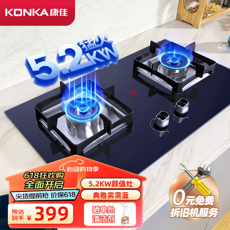 康佳(KONKA)燃气灶双灶具 5.2kW天然气双灶 家用猛火台式/嵌入式 防烫 玻璃灶台 JZT-B520S(天然气)价格:399.00元!