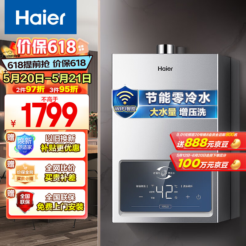海尔(Haier)16升燃气热水器天然气大水量增压洗零冷水 AI自学习节能家用WIFI遥控智能防冻 JSQ30-16IDOL3-TU1价格:1899.00元!